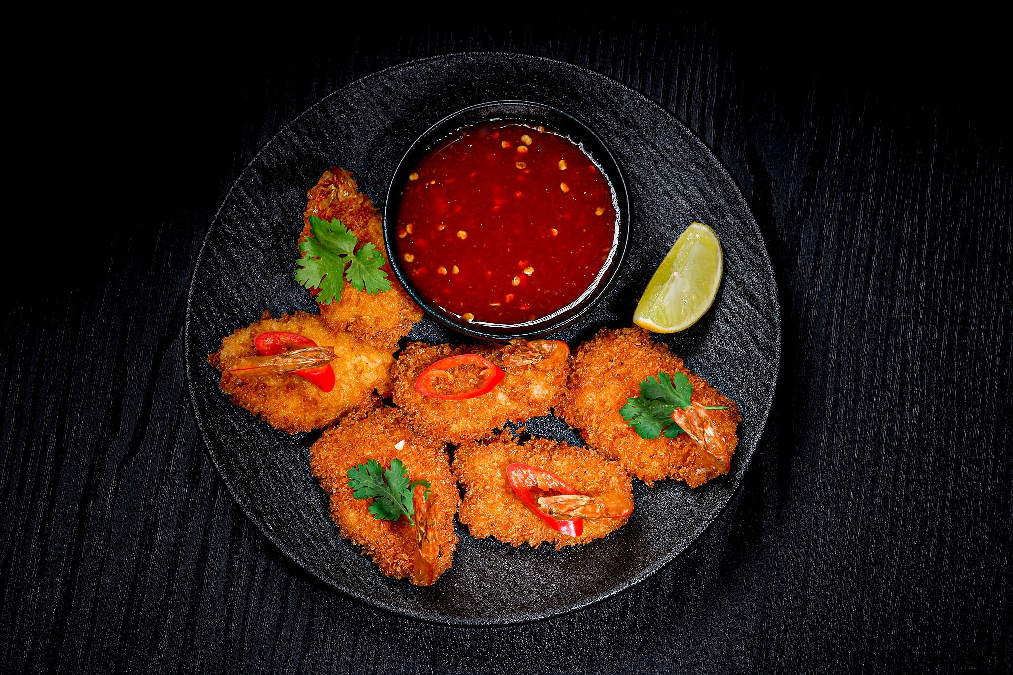 shrimp in crispy panko breadcrumbs, coriander, fresh lime, siracha dipping sauce.
