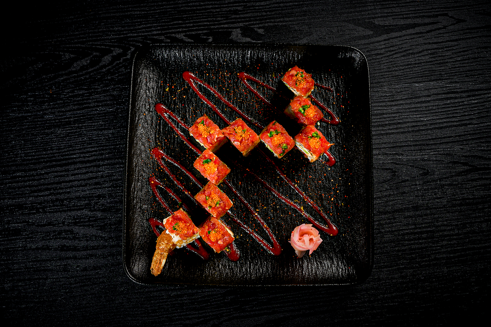 sushi rice, spicy tuna mix, tempura prawns, crab mix, cucumber, avocado, fried shallots, tobiko orange, sriracha sauce, and unagi sauce.
