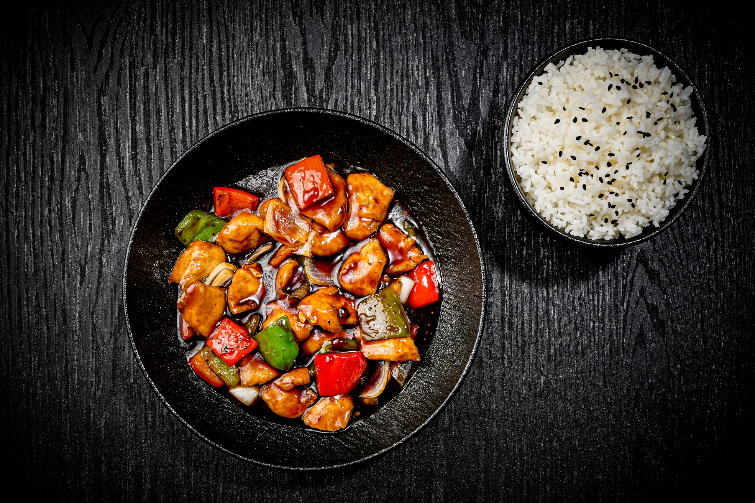 tender protein tossed with bell pepper, red+ green, white onion, garlic, sambal olek, and sesame oil in a flavorful black pepper sauce.