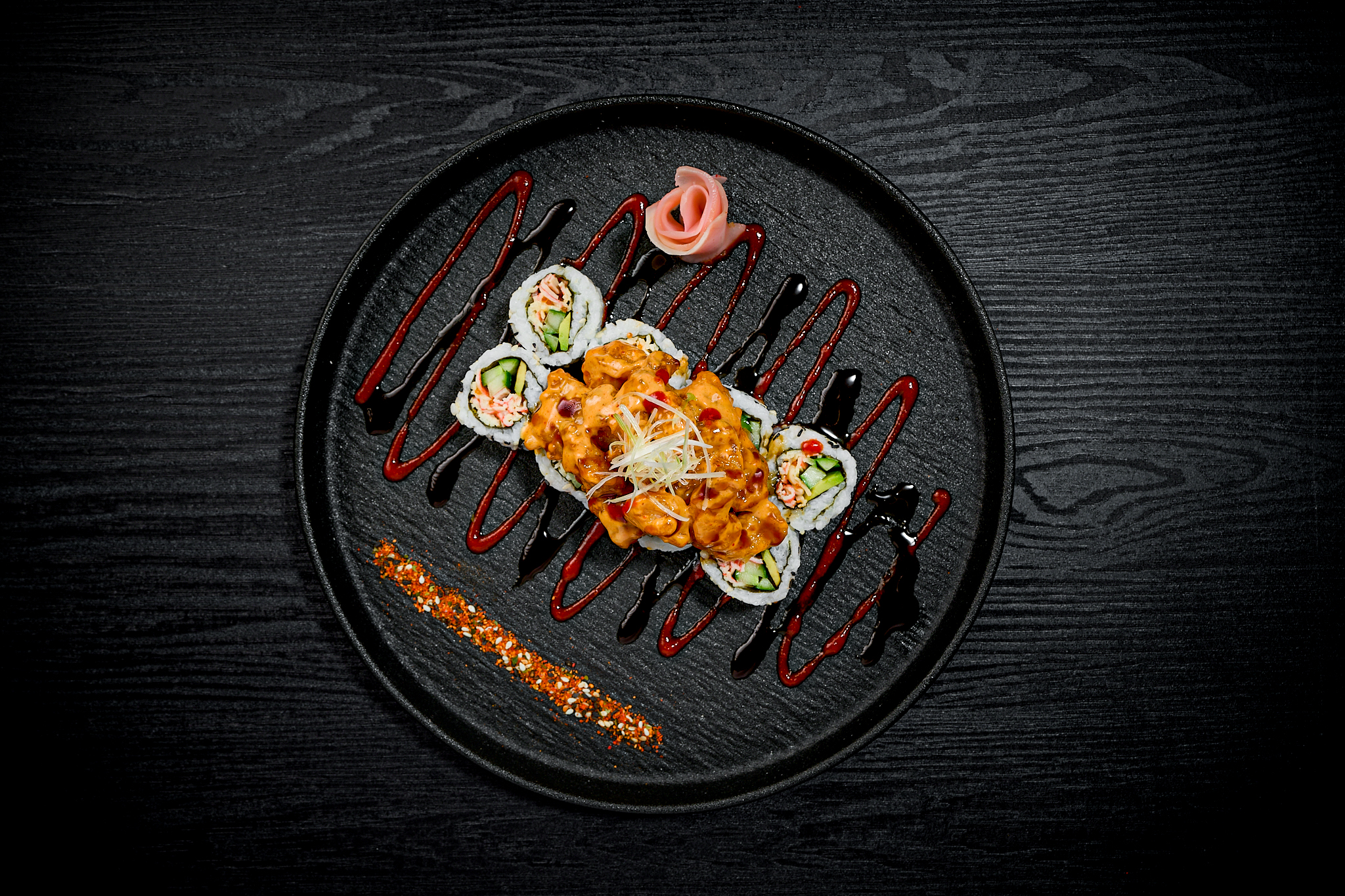 sushi rice, toasted sesame seeds, crab mix, cucumber, avocado, dynamite shrimp, sriracha sauce, and unagi sauce.