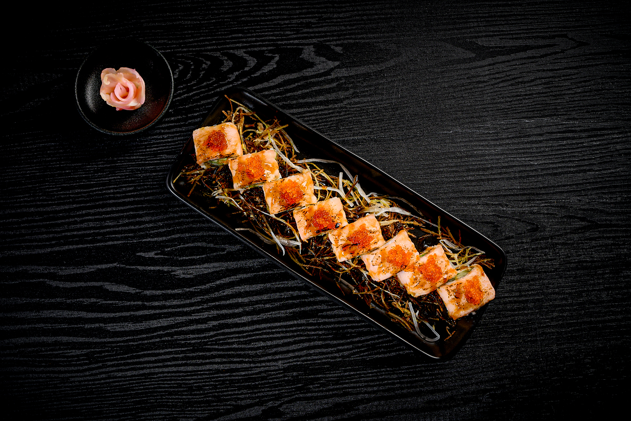 sushi rice, toasted sesame seeds, crab mix, cucumber, avocado, tobiko orange, tempura shrimp, cured salmon slices, sriracha sauce, and unagi sauce.