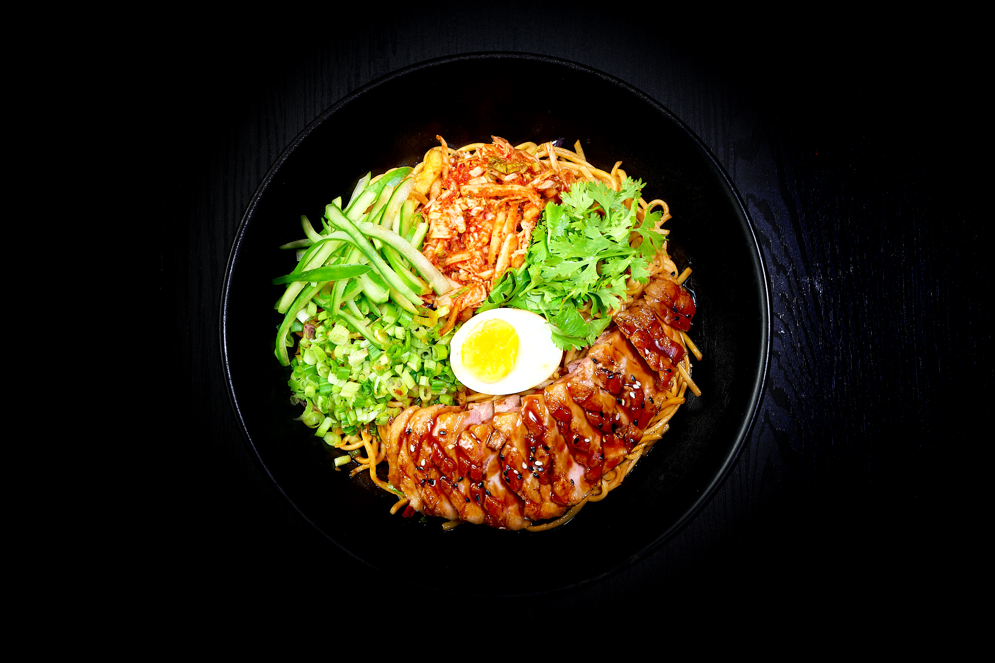 egg noodles, eggplant, kimchi, boiled egg, cucumber, coriander, spring onion, korean bulgogi sauce.