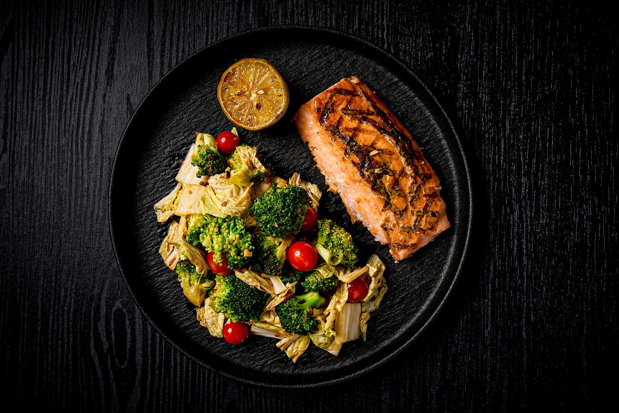 grilled salmon, steamed broccoli, cherry tomato, chinese cabbage, white mushrooms and miso butter.