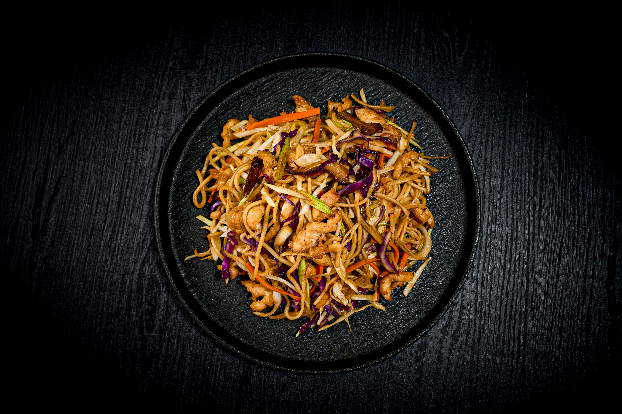 egg noodles stir fried with cabbage mix, carrots, spring onion, mushroom, beans, celery, garlic, and earthy flavored soy sauce.