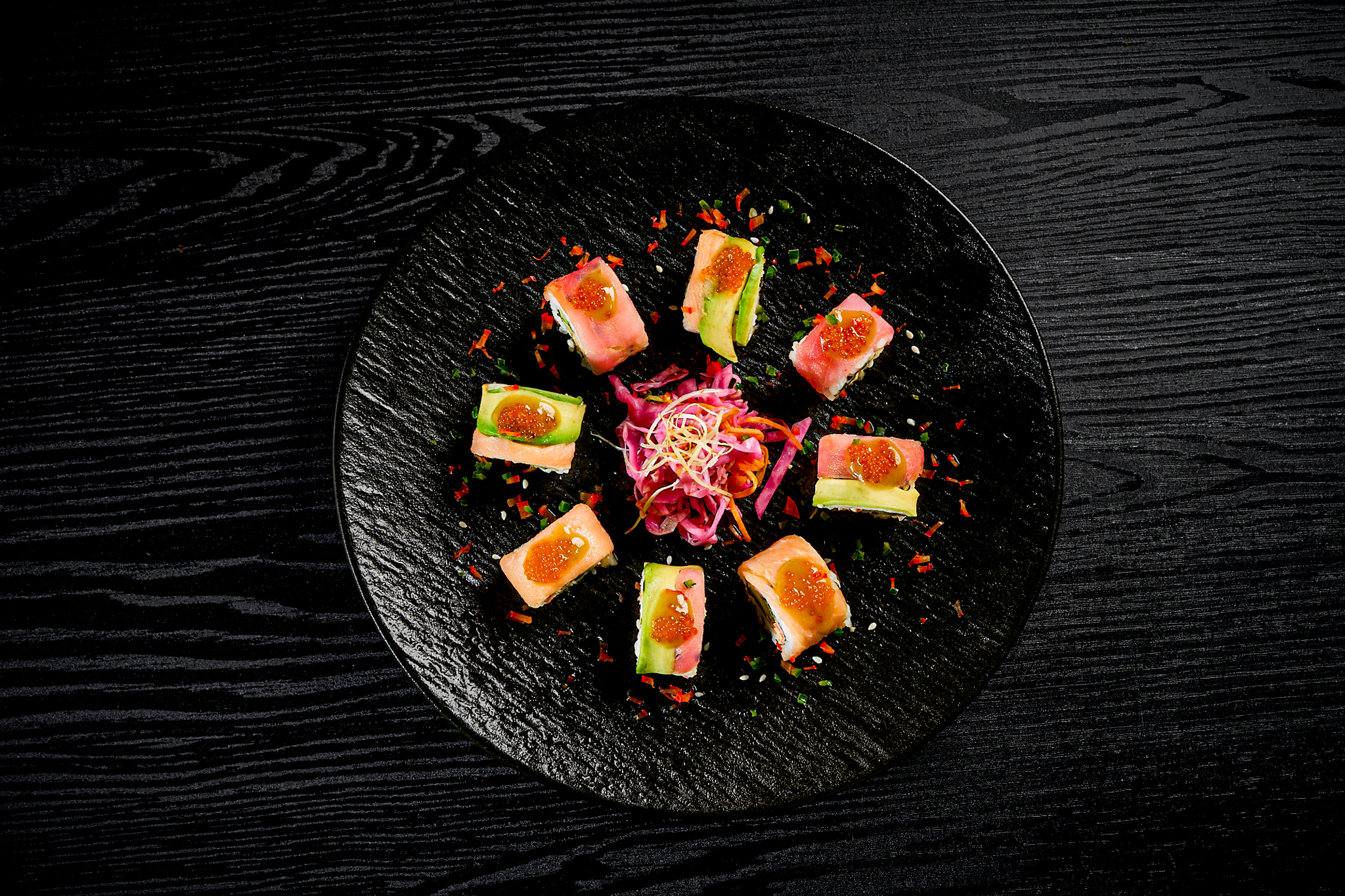 sushi rice, tuna slices, salmon slices, avocado slices, crab mix, cucumber, avocado, tobiko orange, citrus ponzu sauce, unagi sauce.