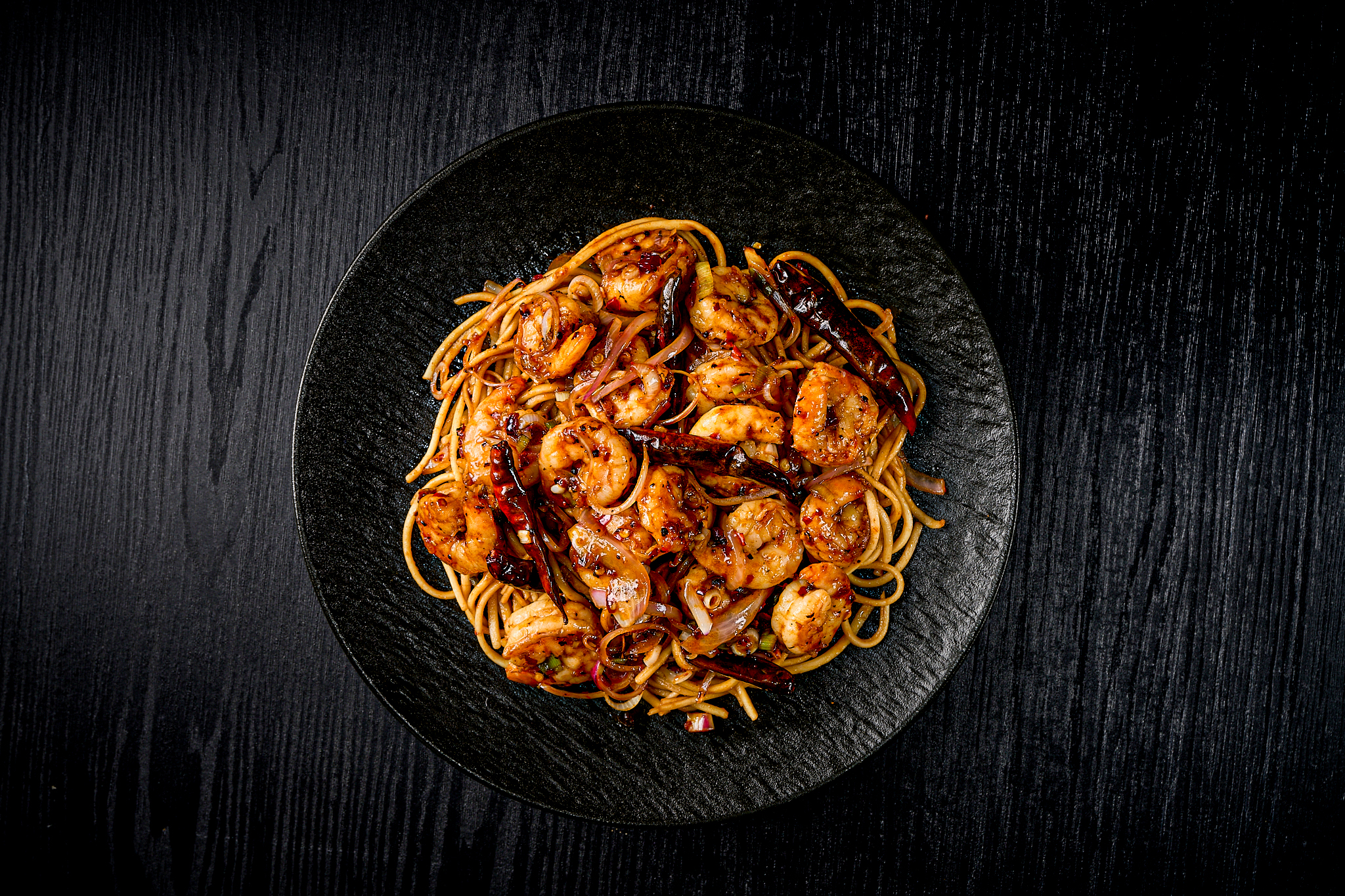 chicken or shrimps tossed with onions, chilli pods, garlic, black beans, chilli spiced butter served over a bed of egg noodles.