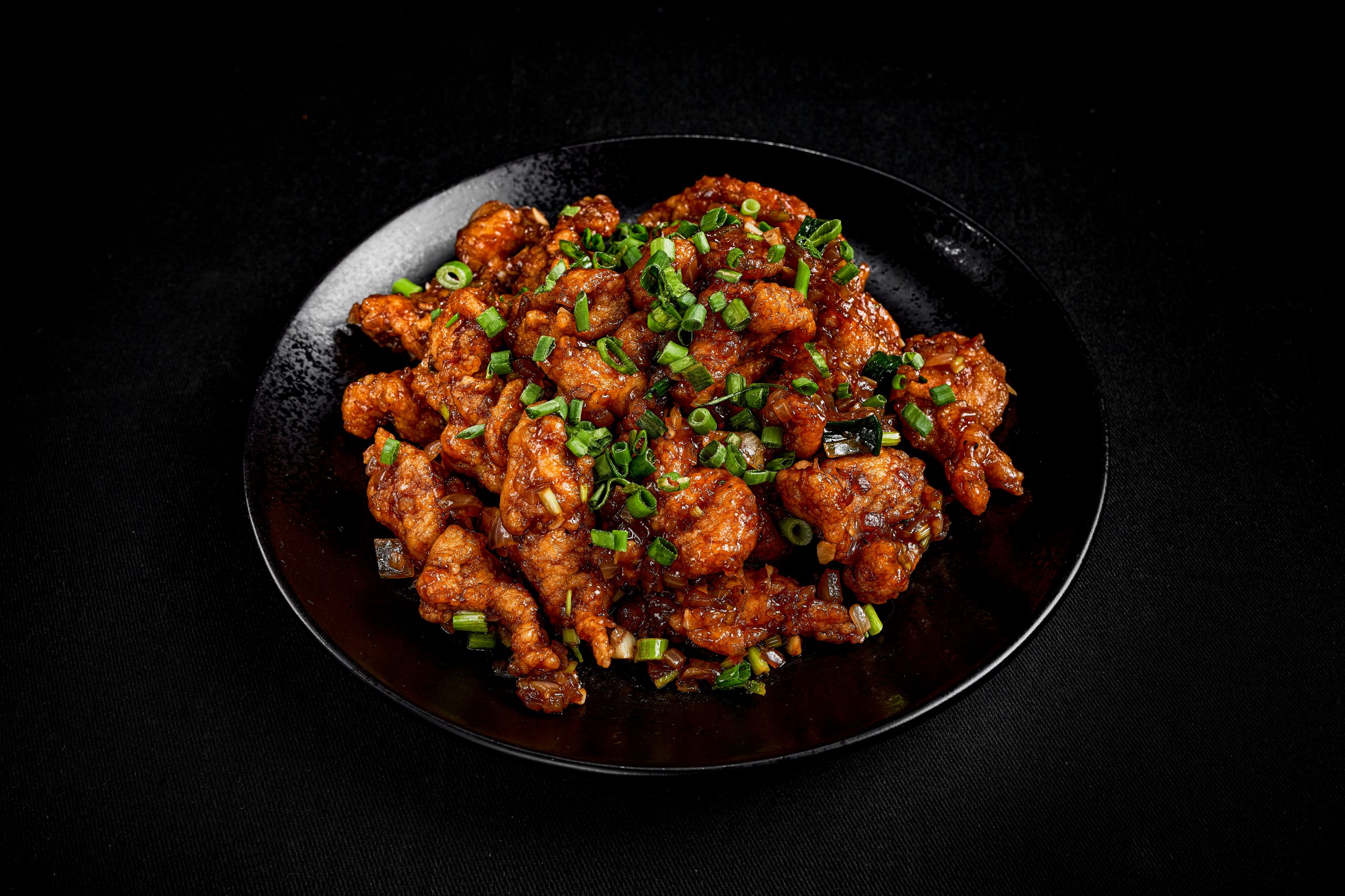 cumin spiced wok seared juicy protein with mint, bell peppers, cherry tomato and onions infused flavors of chilli oil, cherry hoisin and kung pao sauce.