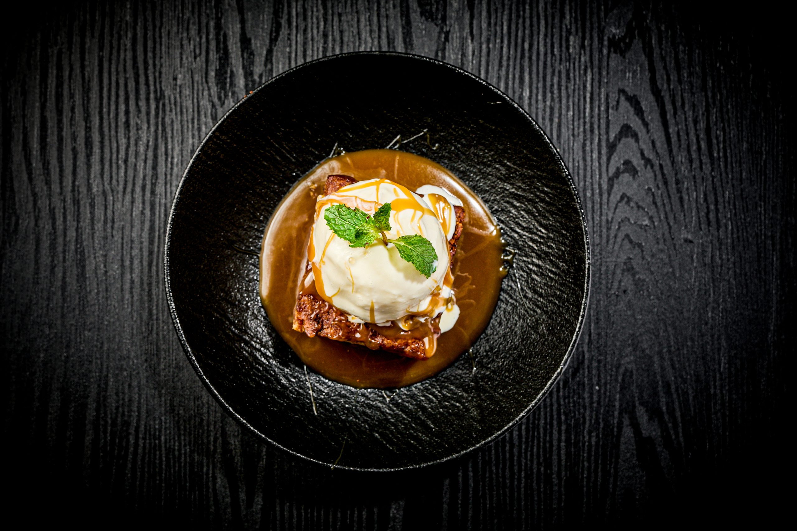 served with vanilla ice cream and a caramelized butter pudding sauce.