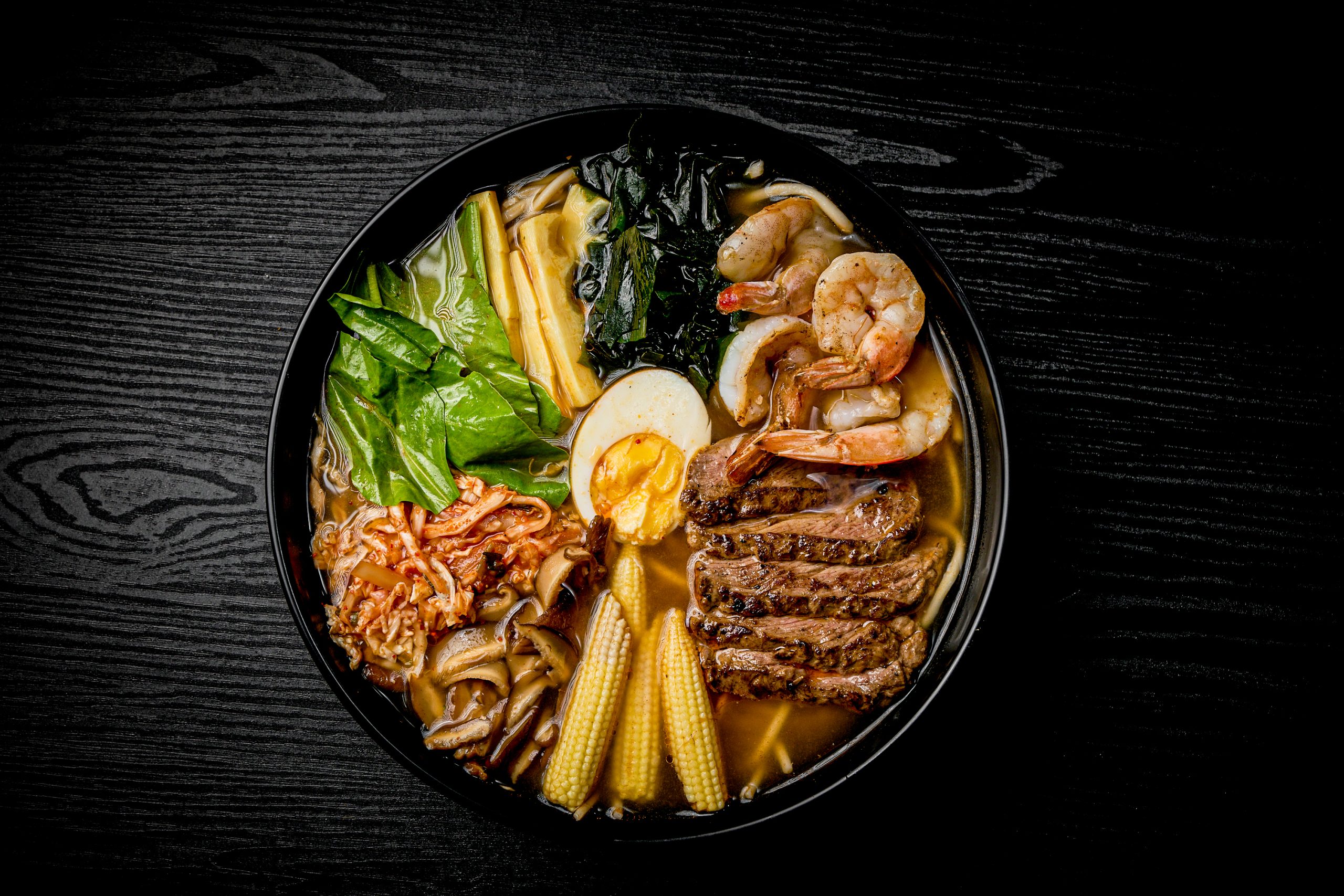 ramen noodle, beef steak, shrimps, kimchi, spinach, shiitake mushroom, tea-stained egg, bamboo shoots, wakame seaweed vegetables and chicken flavored soup.