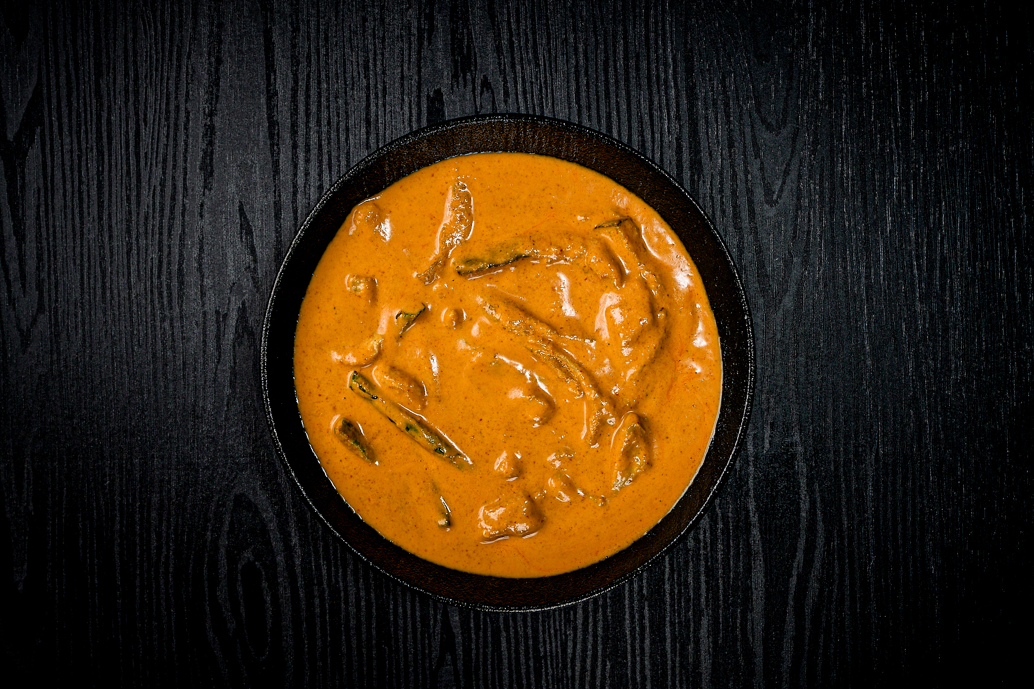 spicy signature thai red curry sauce, green beans, baby corn, boiled tea-stained egg, eggplant, coriander, red chillies, and steamed rice.