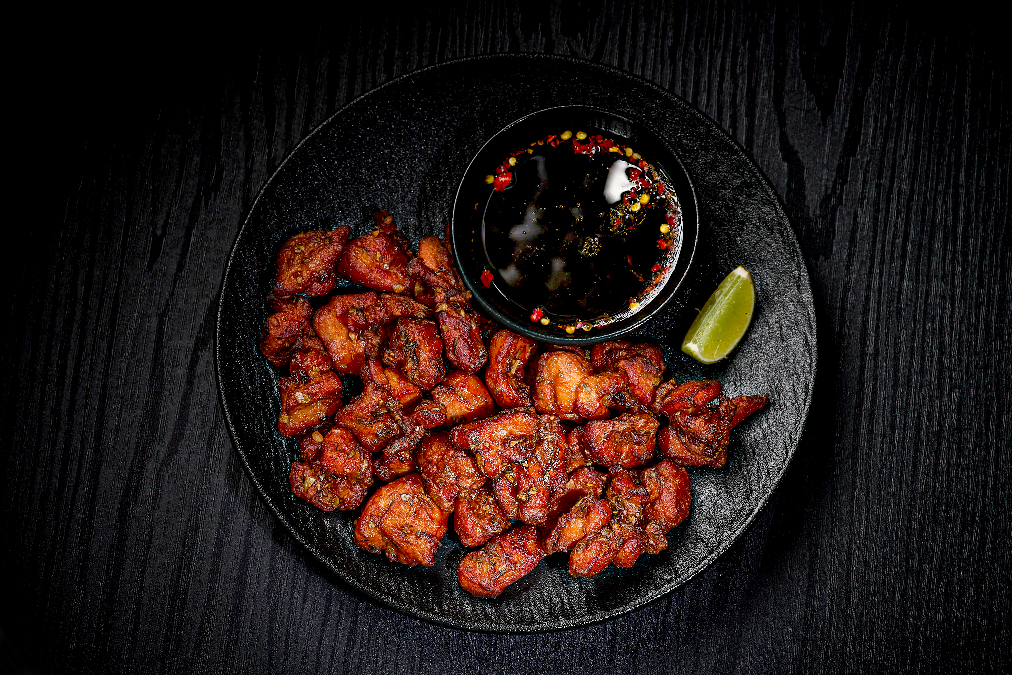 chicken thighs marinated in spicy teriyaki sauce, oregano, thyme, spicy served with gyoza sauce.