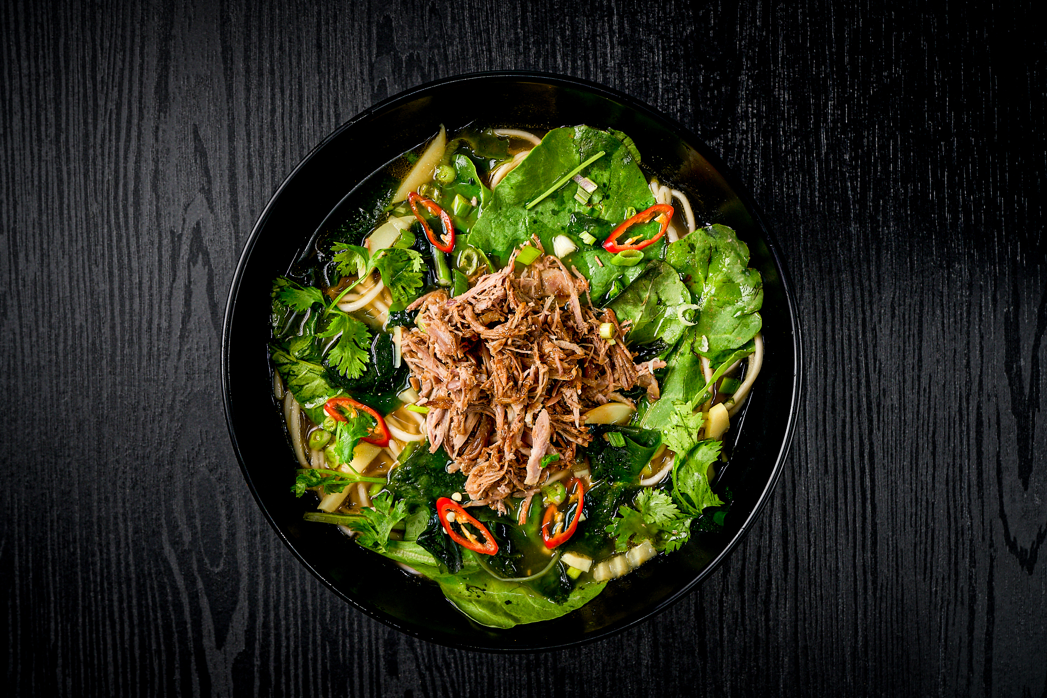 shredded duck, onions, kimchi mix, wakame seaweed, coriander, fresh lime, ramen noodle in freshly made citrus ponzu chicken flavored stock.