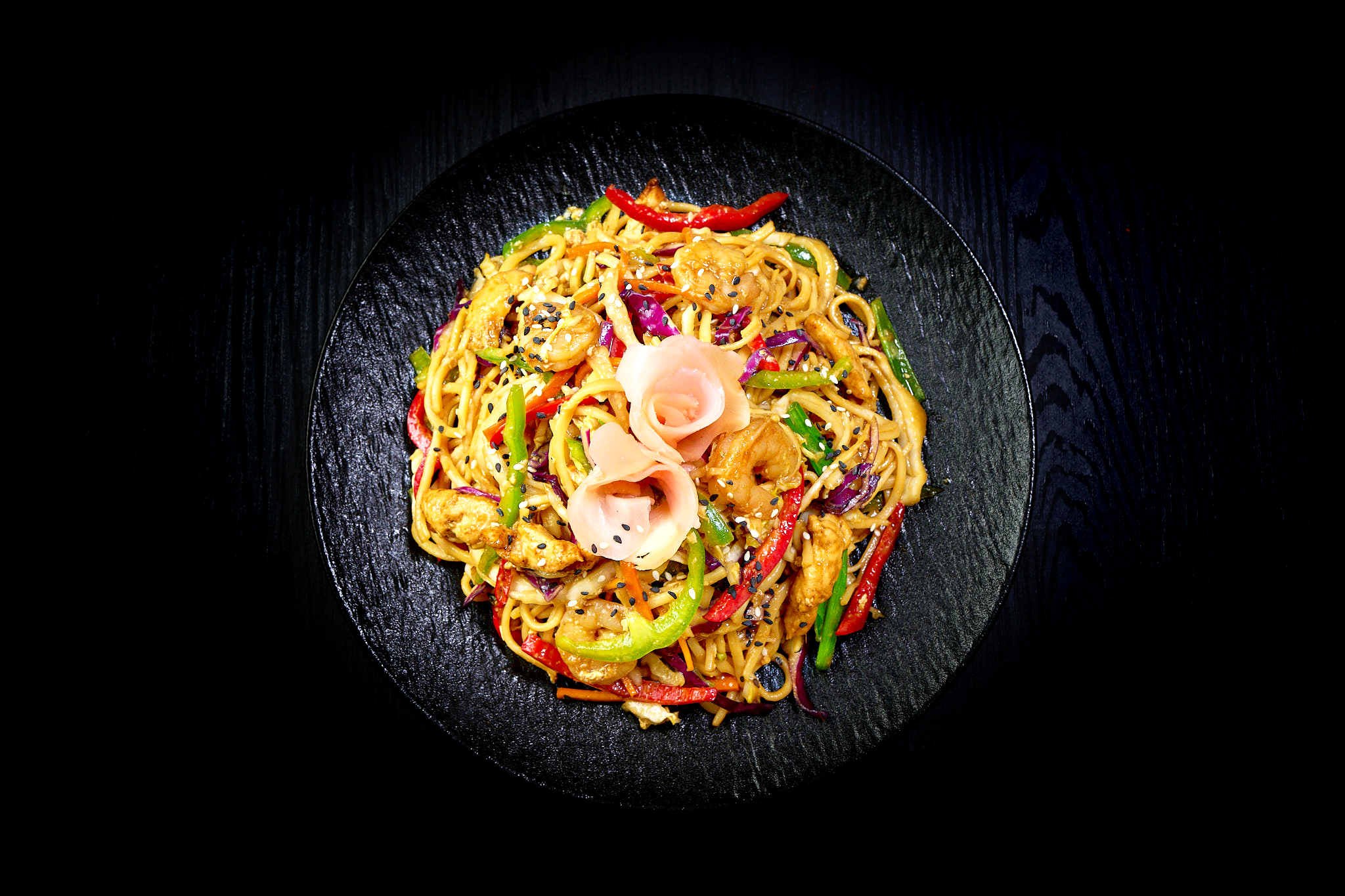 chicken, shrimp, bell pepper green + red, onions, cabbage mix, egg noodles, savory soy sauce, shallots, and pickled ginger.