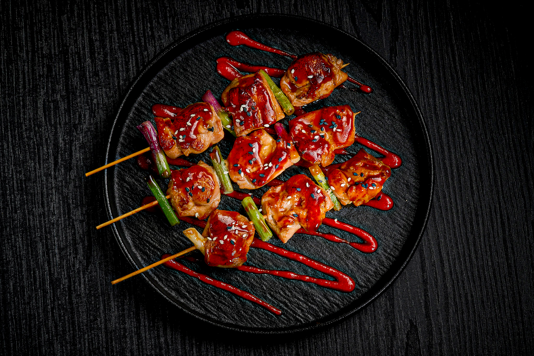 marinated teriyaki glazed chicken thighs spiked in a skewer, grilled into perfection. served with sesame seeds and chilli yakitori sauce.